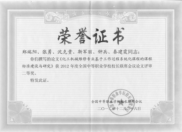 在2012年度全国中等职业学校校长联席会议论文评审中,我校教师踊跃参加,共有26位教师申报了七个课题。在12月26日夏门颁奖会上,七个课题全部获奖。其中,由管铮、贺红举、夏彩玲撰写的《提升中职示范校专业教师胜任力的研究》,梁先霞、张应金、赵虹撰写的《工厂供配电一体化课程开发与实施调研报告》,郑端阳、张勇、沈克贵、靳军丽、钟兵、秦建霞撰写的《化工机械维修专业基于工作过程系统化课程的课程标准建设与研究》,张瑾、刘全营、宋旸、宋安琪、刘亚楠撰写的《动漫专业校企合作实践模式探讨》获得二等奖;毛振红、翟利利撰写的《校企合作运行机制研究》;李永远、丁惠萍、赵瑞、于淼撰写的《中职院校化工专业心智技能培养与探索》;许凌志、李艳玲、夏彩玲、刘琴撰写的《推动优秀企业文化进校园、进课堂的探索》获得三等奖。这些成绩的取得将对我校的示范校建设起到有力的推进作用。